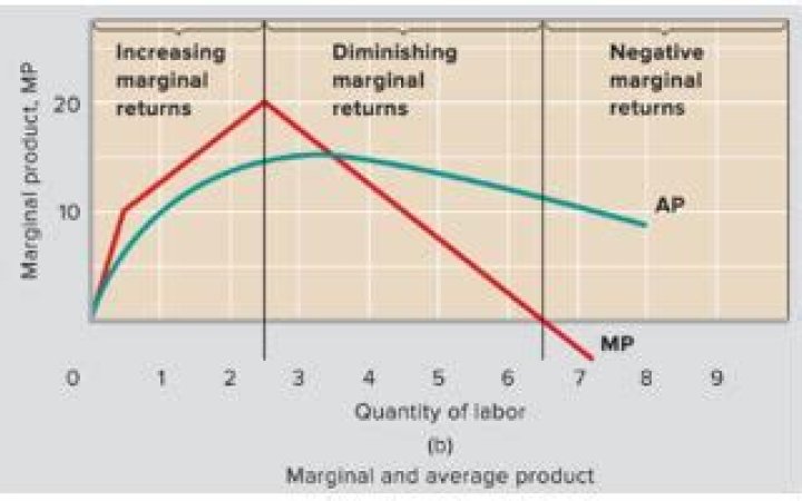 As more and more of variable input (labor) is employed, marginal product starts to fall. Finally, after a certain point, the marginal product becomes negative, implying that the additional unit of labor has decreased the output, rather than increasing it..