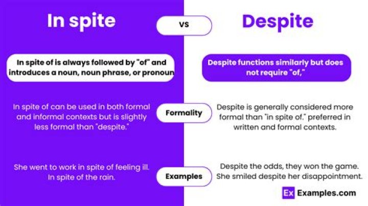 After in spite of and despite, we use a noun, gerund (-ing form of a verb) or a pronoun. They never made much money, in spite of their success. In spite of the pain in his leg, he completed the marathon. Despite having a headache, I had a great birthday.What is the synonym of spite?