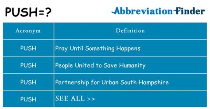 PUSH. Praise Until Something Happens. Note: We have 22 other definitions for PUSH in our Acronym Attic.What is the synonym of push?