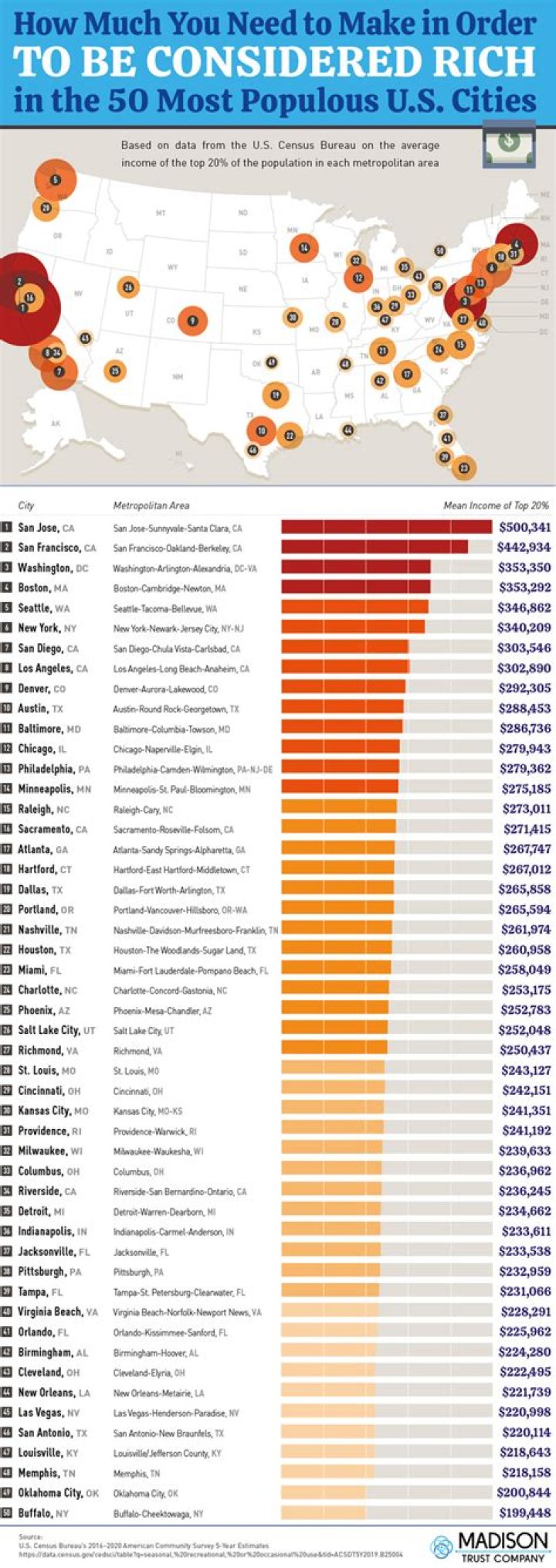 One half, 49.98%, of all income in the US was earned by households with an income over $100,000, the top twenty percent. Over one quarter, 28.5%, of all income was earned by the top 8%, those households earning more than $150,000 a year. The top 3.65%, with incomes over $200,000, earned 17.5%.What is middle class income in California?
