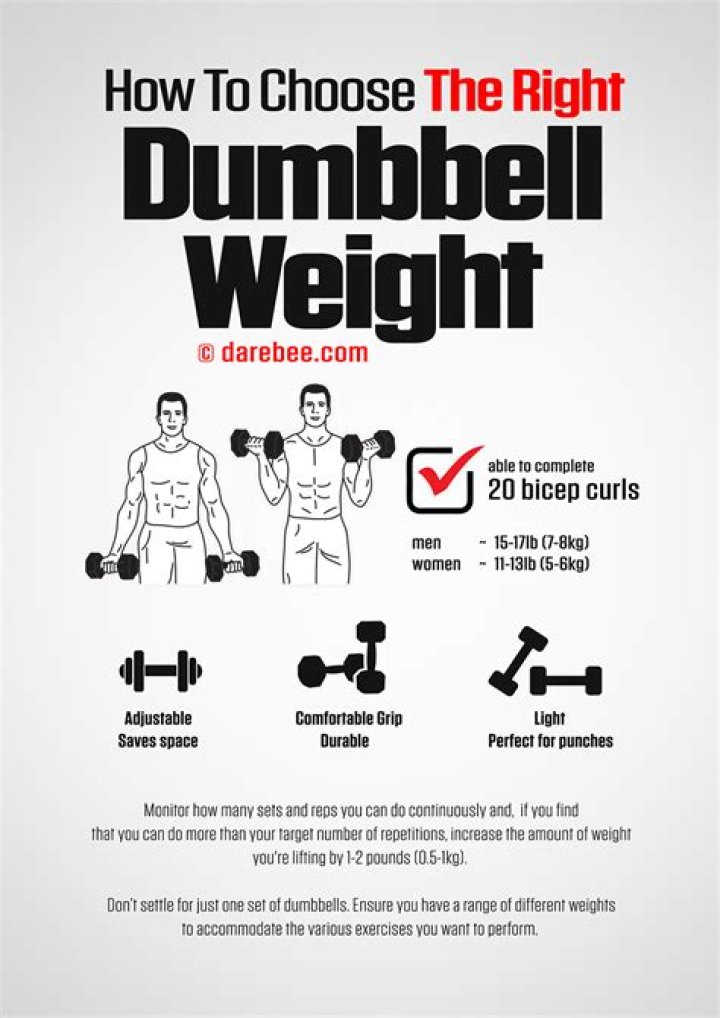 To tone your arm muscles, consider starting with 2- to 3-pound dumbbells, all the way up to 5- to 10-pound dumbbells for women and 10- to 20-pound dumbbells for men. Once you can do 12 to 15 repetitions with little effort, it's time to increase the weights.What weight dumbbells should a woman use?
