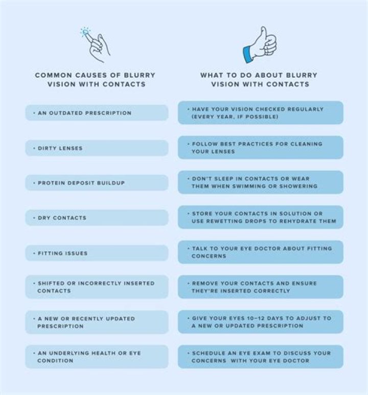 Dryness of the contact lenses or the eyes When dryness is the cause of the blurred vision, the vision usually gets a little clearer immediately after a blink or after putting in a contact lens rewetting drop. If the eye itself gets dry, this can also cause the vision to appear blurry.How long can Contacts sit in solution?
