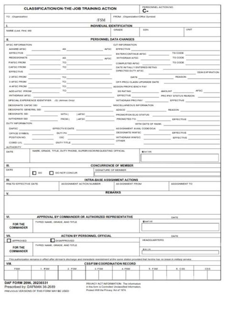 IMA AF Form 2096 Submission for Classification/On-the-Job Training Actions. Use the AF Form 2906 to request award, upgrade, correction, or re-designation of an AFSC, Special Duty Identifier (SDI), Reporting Identifier (RI), Special Experience Identifier (SEI) or Training Status Code (TSC).