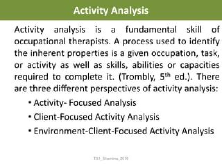 An activity may be composed of many tasks. Tasks are highly repetitive, highly formalized, and rigidly defined. A task is the lowest unit of work within the scope of the analysis. Task analysis is the final level of system decomposition.What is the difference between activity analysis and occupational analysis?