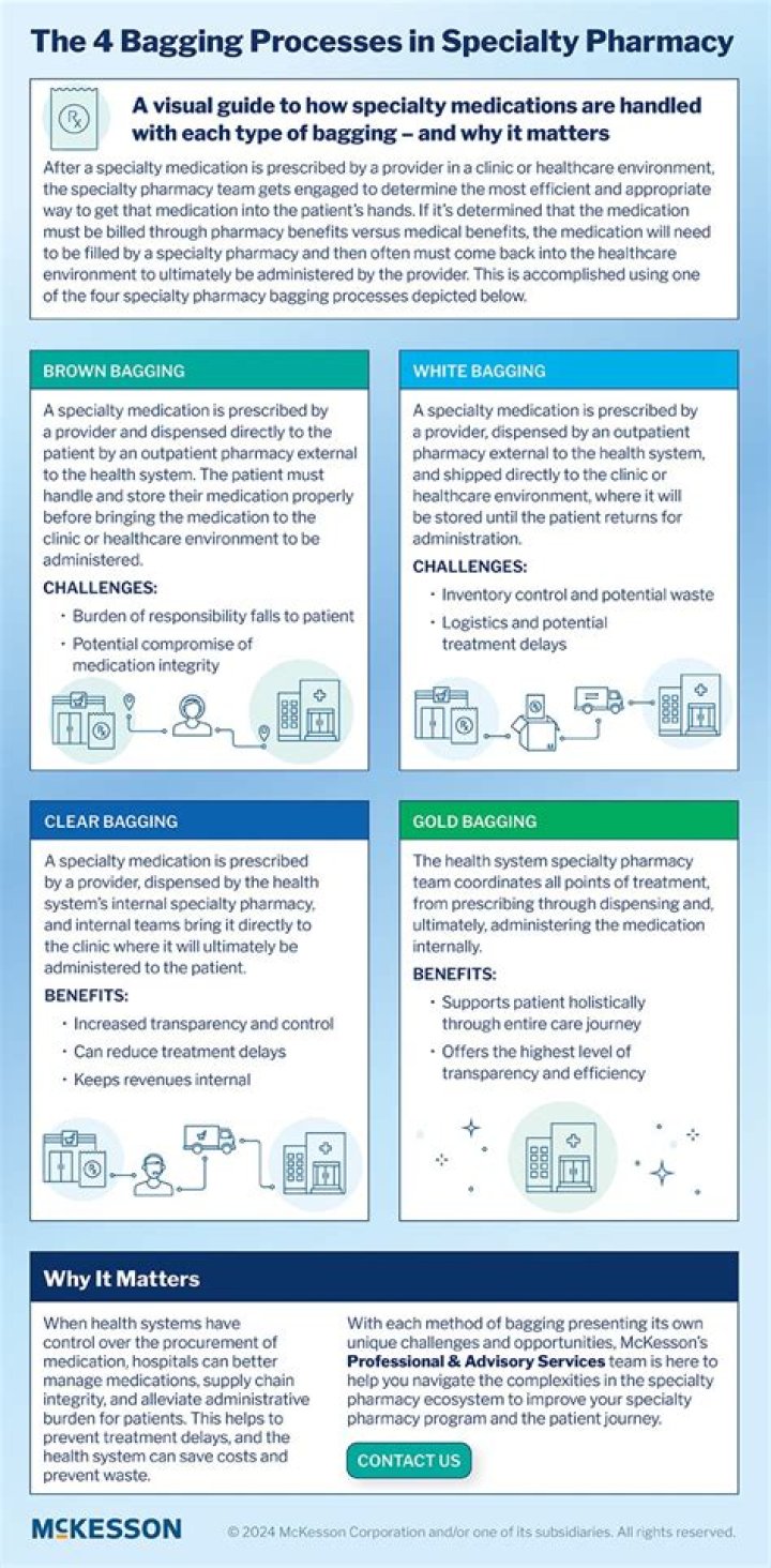 “Brown bagging” is when a patient acquires specialty medication from a pharmacy and takes it to the physician's office for administration. With white bagging, providers need to stock and store the medication for each patient, keeping it separate from hospital and office stocks, which can be logistically challenging.