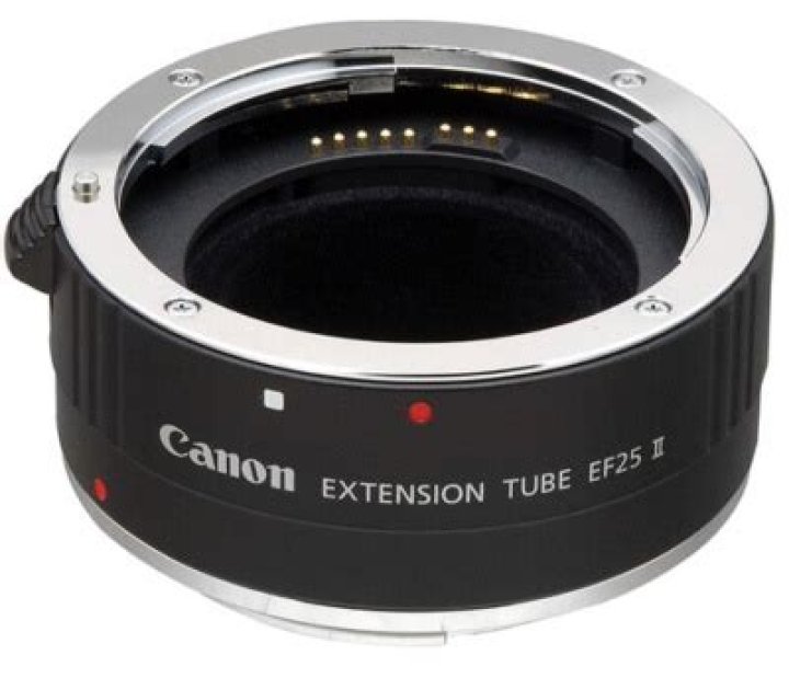 The Canon EF 25mm Extension Tube II is used to allow a lens to focus closer than it does natively. This is accomplished by moving the lens 25mm farther away from the camera body's sensor/film plane by fitting between the camera body and the lens..