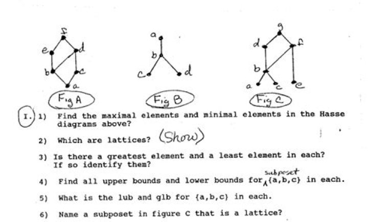 In mathematics, especially in order theory, a maximal element of a subset S of some partially ordered set (poset) is an element of S that is not smaller than any other element in S. A minimal element of a subset S of some partially ordered set is defined dually as an element of S that is not greater than any otherHow do you determine if a Poset is a lattice?