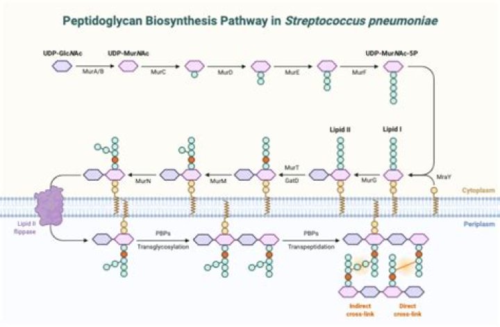 The biosynthesis of bacterial cell wall peptidoglycan is a complex process that involves enzyme reactions that take place in the cytoplasm (synthesis of the nucleotide precursors) and on the inner side (synthesis of lipid-linked intermediates) and outer side (polymerization reactions) of the cytoplasmic membrane..
