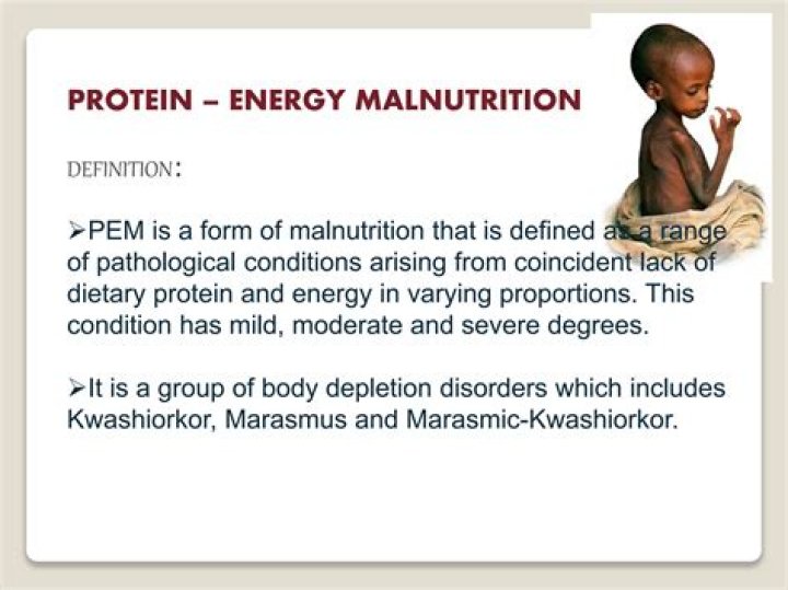 One may also ask, what is PEM name two form of PEM with their causes? Types of PEM Primary PEM results from a diet that lacks sufficient sources of protein. Marasmus, a PEM disorder, is caused by total calorie/energy depletion rather than primarily protein calorie/energy depletion. Marasmus is characterized by stunted growth and wasting of muscle and tissue.