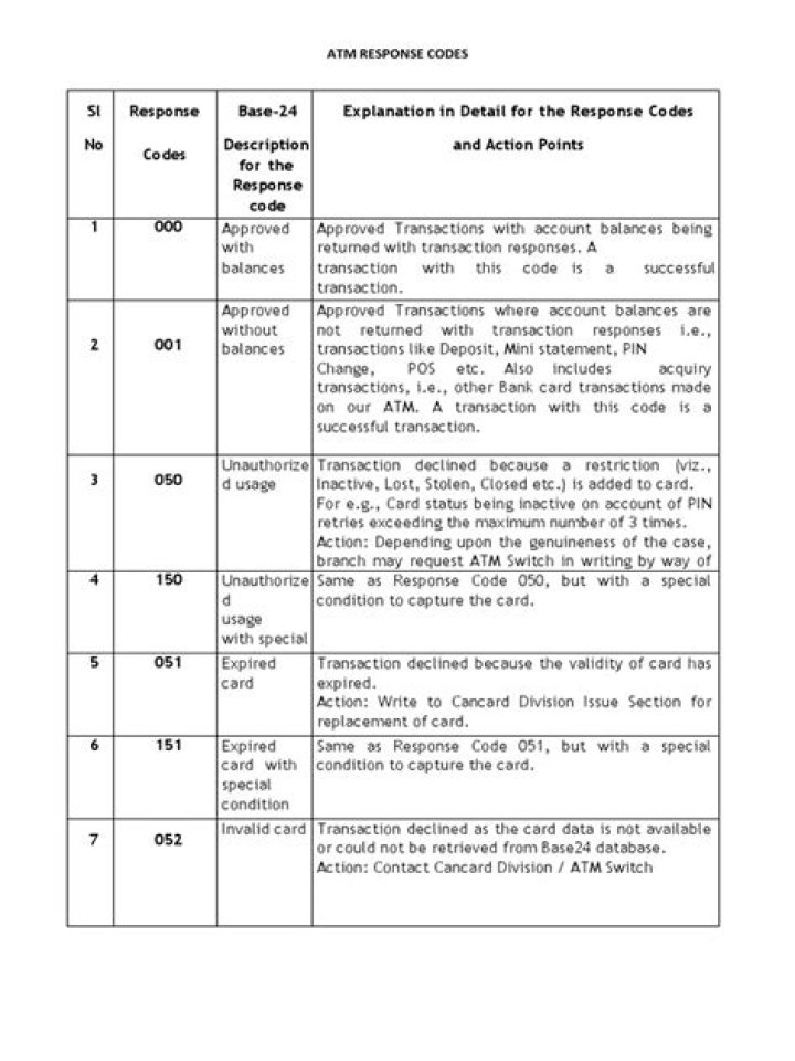 ATM Response Code List.