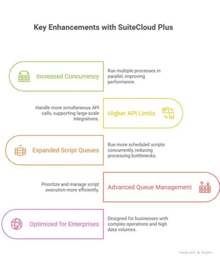 mechanism that enables high-traffic NetSuite customers to increase throughput for their transactions. To use an analogy, SuiteCloud Plus is equivalent to expanding a two-lane road to four or more lanes, proportionally increasing traffic volume while the speed limit remains the same.
