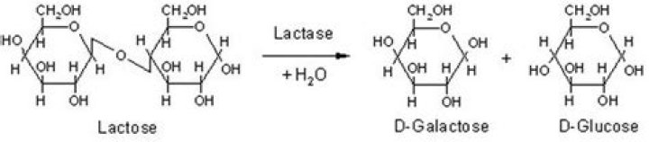 The enzyme you will be studying in this experiment is lactase, and the reaction it catalyzes is the hydrolysis of the disaccharide lactose into the monosaccharides galactose and glucose. Humans require this enzyme for digestion of lactose found in milk and other dairy products.What happens if you're lactose intolerant and you keep eating dairy?