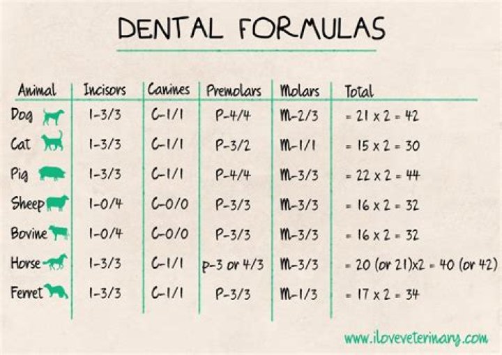 The dental formula represents the arrangement of teeth in each half of the upper and the lower jaw. The entire formula is multiplied by two to represent the total number of teeth. Each half of the upper jaw and the lower jaw has 2 incisors, 1 canine, and 2 molars. Premolars are absent in milk teeth hence the zero.