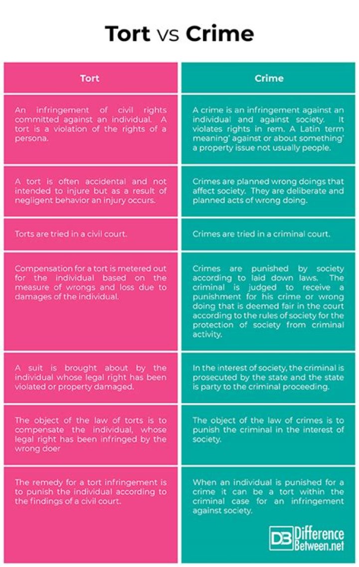 Understanding the difference between crimes and torts is important because the law treats them in different ways. TORTS: A tort is a wrongful act that injures or interferes with another's person or property. CRIMES: A crime is a wrongful act that the state or federal government has identified as a crime.
