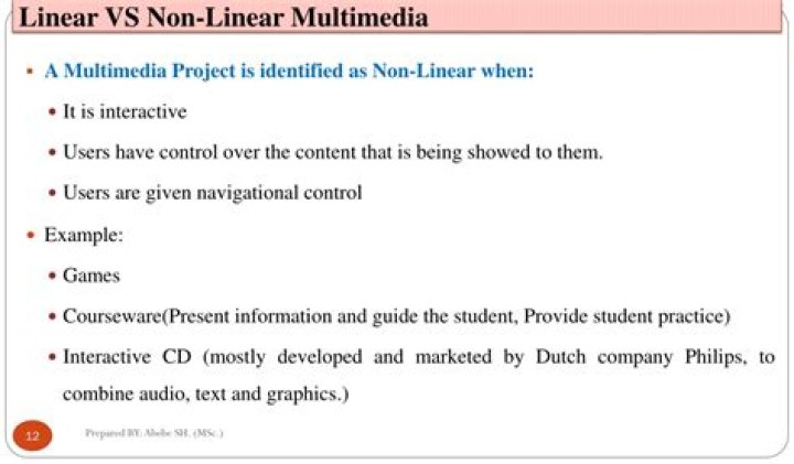 Non-linear multimedia is a nonsequential type of multimedia where the person's participation is crucial. In this type of media, the person needs to interact with a computer program, thus making him in control of the experience. With the presence of an interface, the person and the computer interacts with each other.What is a linear structure in media?