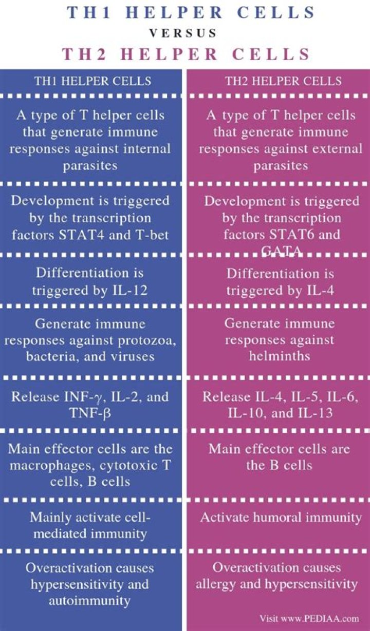 The two helper T cell classes also differ by the type of immune response they produce. While Th1 cells tend to generate responses against intracellular parasites such as bacteria and viruses, Th2 cells produce immune responses against helminths and other extracellular parasites..