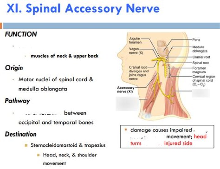 Subsequently, question is, what happens if the accessory nerve is damaged? The spinal accessory nerve originates in the brain and enables motion in the trapezius and sternomastoid muscles in the neck. A spinal accessory nerve injury can be caused by trauma or damage during surgery, resulting in shoulder pain, "winging" of the shoulder blades and weakness of the trapezius muscle.