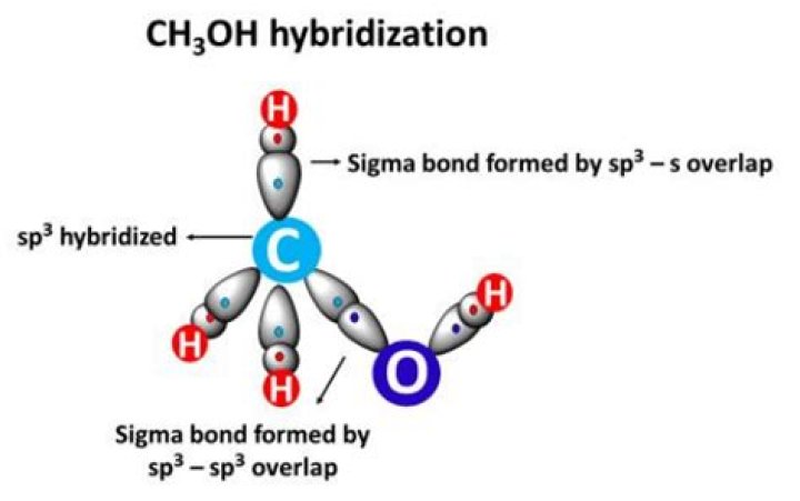 Methanol. The oxygen is sp3 hybridized which means that it has four sp3 hybrid orbitals. One of the sp3 hybridized orbitals overlap with s orbitals from a hydrogen to form the O-H signma bonds..