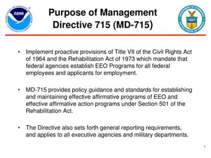 Management Directive 715 (MD-715) is the policy guidance that the Equal Employment Opportunity Commission (EEOC) provides to federal agencies, including the Department of State, for use in establishing and maintaining effective programs of equal employment opportunity under Section 717 of Title VII of the Civil Rights.