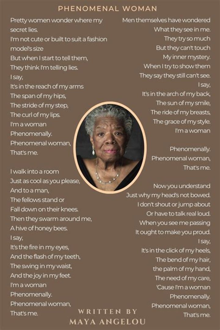 In Angelou's favorite poem, "Still I Rise", which shares its title with a play she wrote in 1976, she refers to the indomitable spirit of Black people, using repetition and the categorization of injustices against them. Despite adversity and racism, Angelou expresses her faith that one will overcome and triumph.What is being a woman?