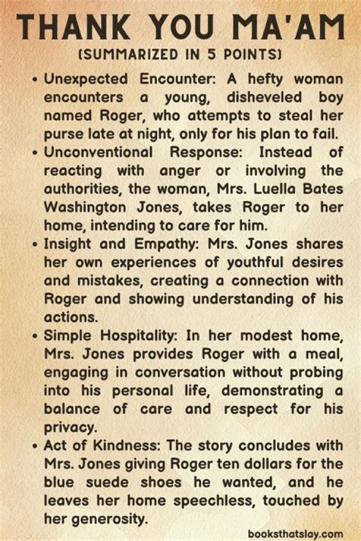 Thank You, Ma'am by Langston Hughes, tells the story of Mrs. Jones, an elderly woman walking home, and Roger, a teenager who tries to steal her purse so he can buy a new pair of blue suede shoes. A literary theme in Hughes's story is second chances, and how they can change a person's life.
