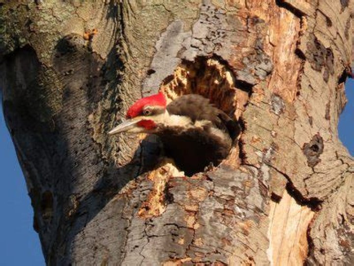 Pileated woodpeckers have been observed to move to another site if any eggs have fallen out of the nest—a rare habit in birds. The cavity is unlined except for wood chips. Both parents incubate three to five eggs for 12 to 16 days. The average clutch size is four per nest.
