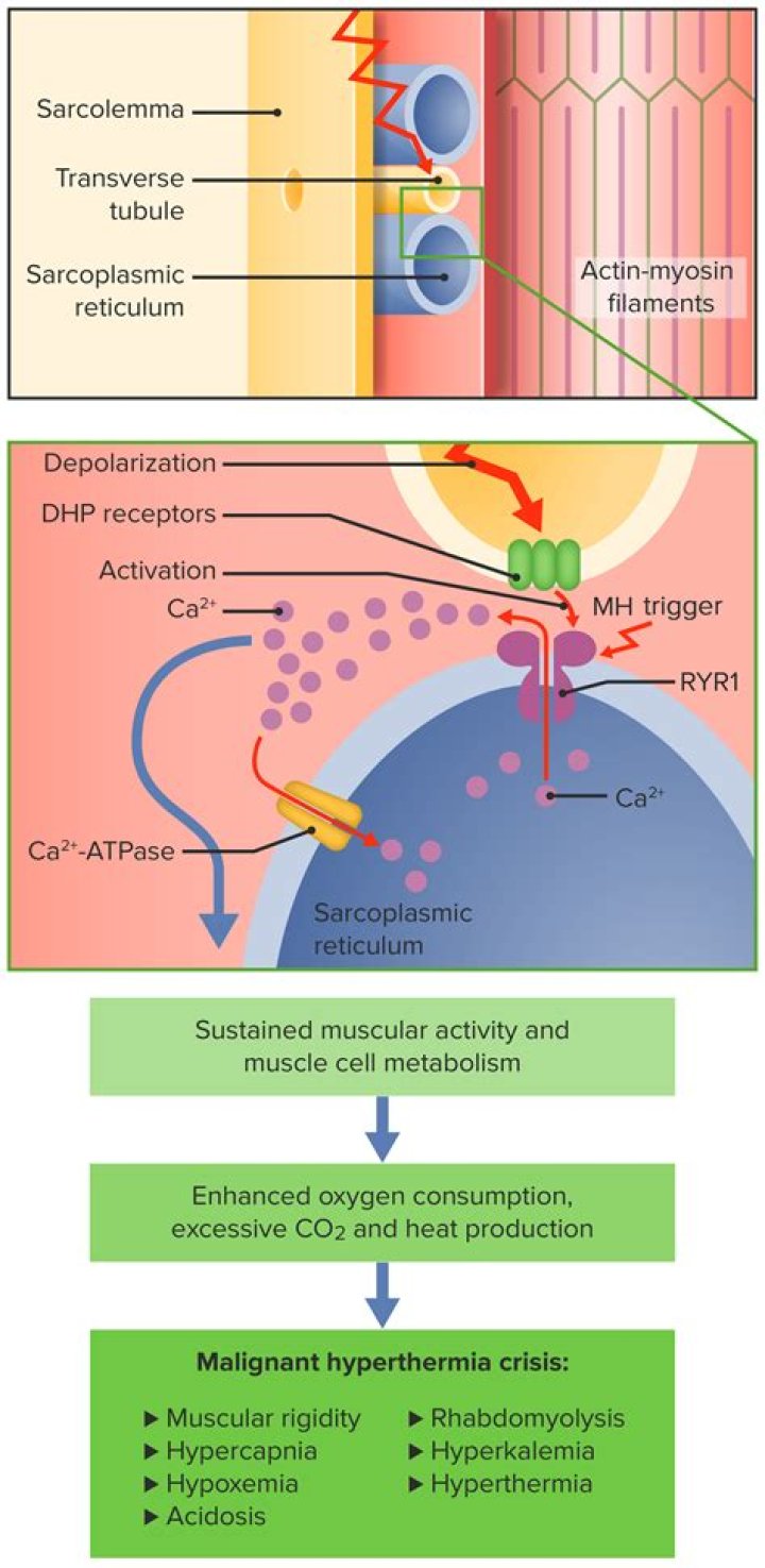 The most common triggering agents are volatile anesthetic gases, such as halothane, sevoflurane, desflurane, isoflurane, enflurane or the depolarizing muscle relaxants suxamethonium and decamethonium used primarily in general anesthesia.