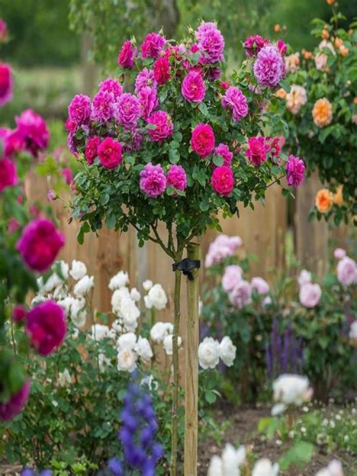 A standard rose (Rosa spp.) or tree rose is created by grafting a long stem onto hardy rootstock then grafting a rose bush on top of the stem. Any type of rose bush can be used but they are especially popular with Old English and David Austin hybrid roses.