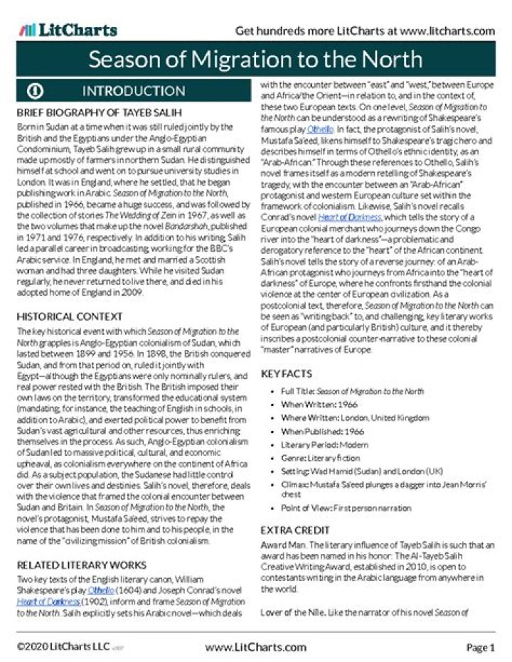 Season of Migration to the North Summary. The unnamed narrator returns to his hometown, Wad Hamid, a small village near the Nile in northern Sudan, after studying in British poetry in London for seven years.