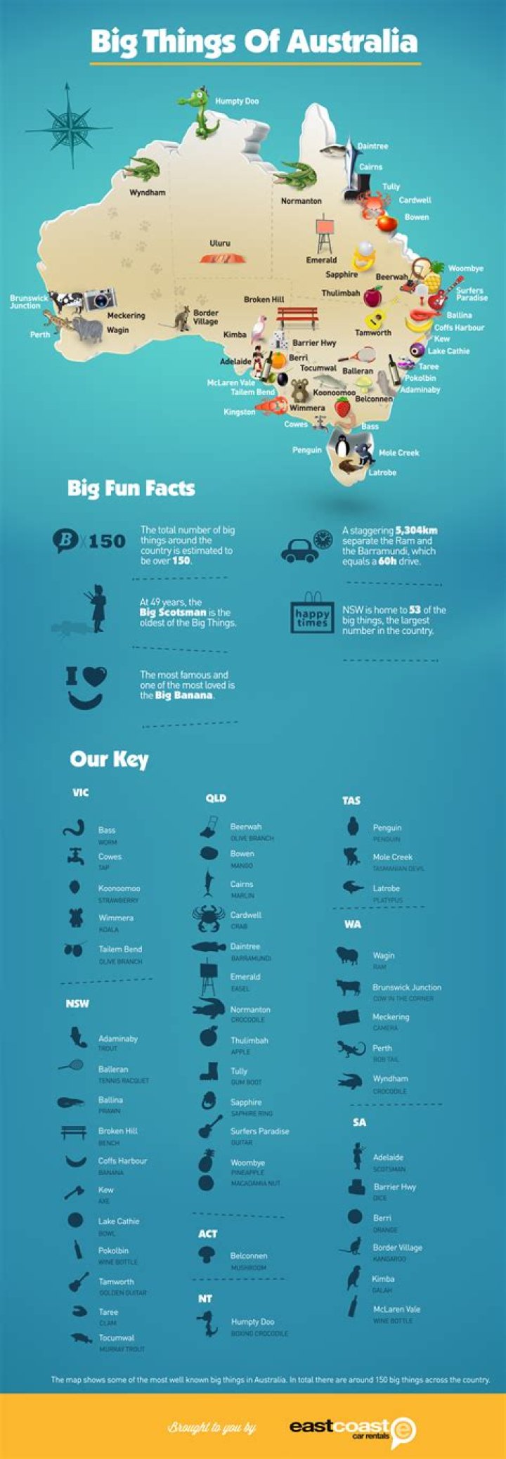 There are estimated to be over 150 such objects around the country. There are big things in every state and territory in continental Australia. Most big things began as tourist traps found along major roads between destinations.
