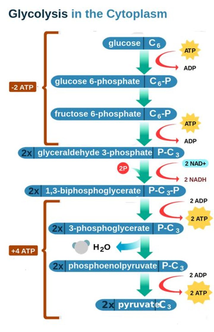 Glycolysis is the process of breaking down glucose. Glycolysis can take place with or without oxygen. Glycolysis produces two molecules of pyruvate, two molecules of ATP, two molecules of NADH, and two molecules of water. Glycolysis takes place in the cytoplasm.Does glycolysis take place in photosynthesis?