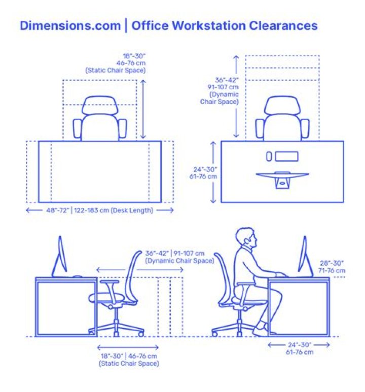 So what are standard desk dimensions fordifferent heights? For people between 5 feet, 8 inches tall and 5feet, 10 inches tall, the proper height is anything between28 inches and 30 inches. Those who are shorter or taller than thatheight range may find it a little difficult working withsuch a height.How much space should there be between desks in an office?