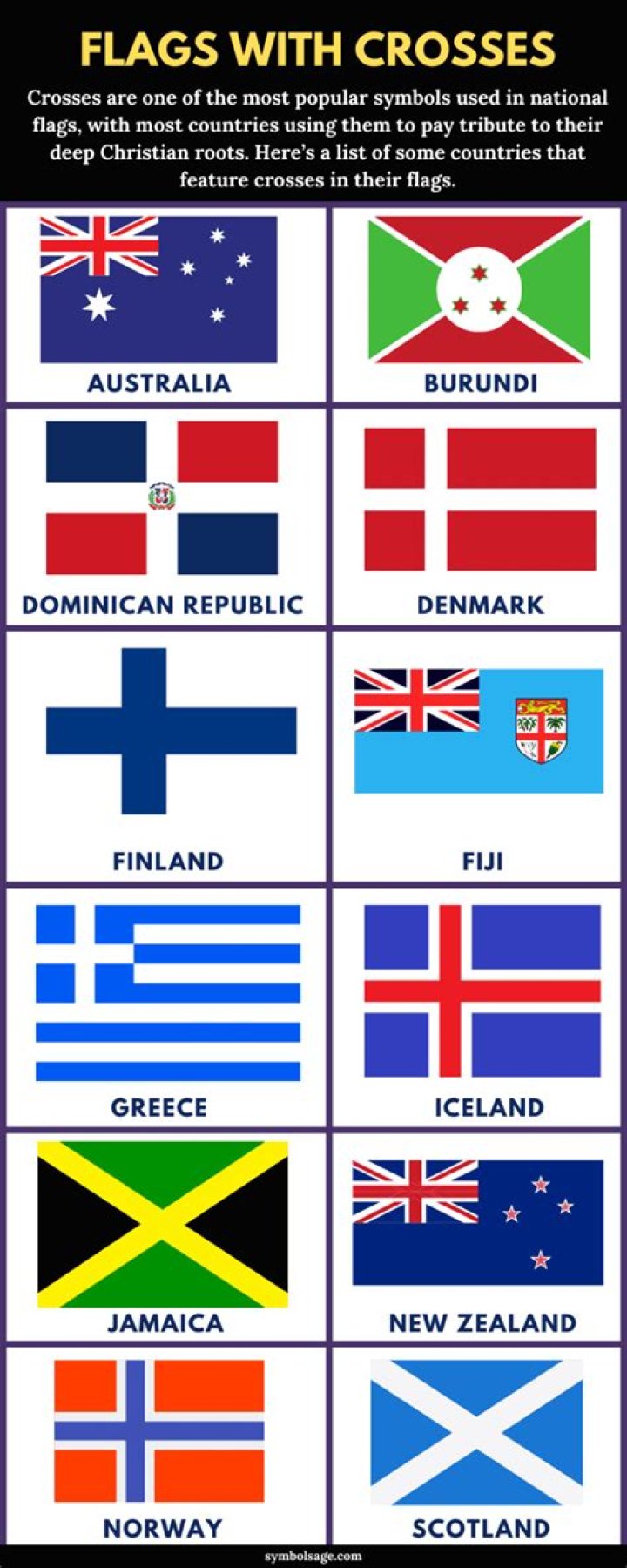 The so-called Scandinavian crosses or Nordic crosses on the flags of the Nordic countries–Denmark, Finland, Iceland, Norway and Sweden–also represent Christianity..