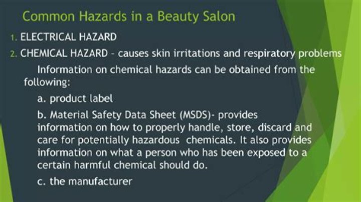Similarly, what is chemical hazard in beauty salon? Hazardous Chemicals Found in Nail Salon Products Acetonitrile (fingernail glue remover): irritated nose and throat; breathing problems; nausea; vomiting; weakness; and exhaustion. Dibutyl phthalate (DBP), (nail polish): nausea and irritated eyes, skin, nose, mouth, and throat.