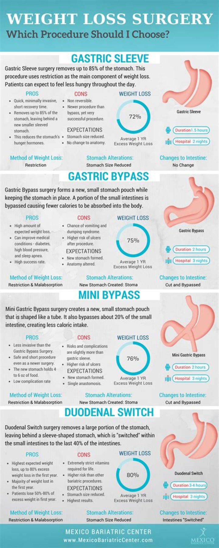 what are the different types of weight loss surgery? The most common bariatric surgery procedures are gastric bypass, sleeve gastrectomy, adjustable gastric band, and biliopancreatic diversion with duodenal switch. Each surgery has its own advantages and disadvantages.