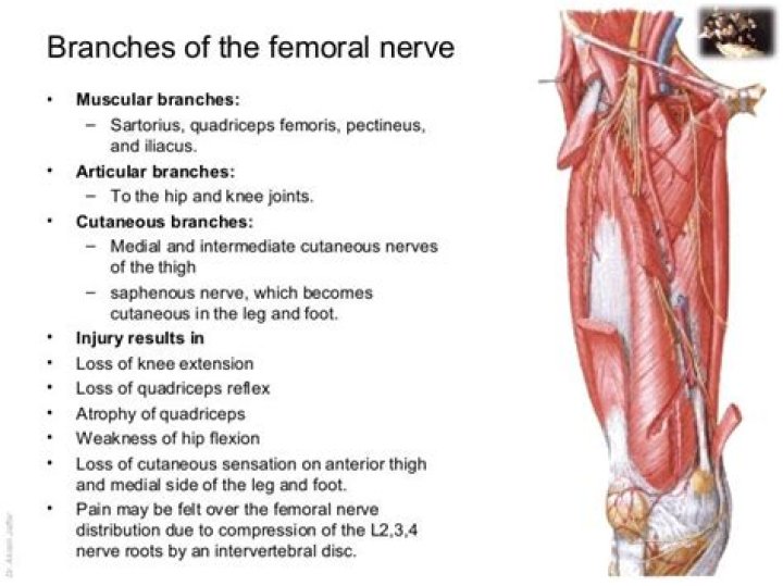 The nerve descends from the lumbar plexus in the abdomen, travelling down through the fibres of psoas major. The terminal cutaneous branch of the femoral nerve is the saphenous nerve which continues, with the femoral artery and vein, through the adductor canal.What causes a pinched femoral nerve?