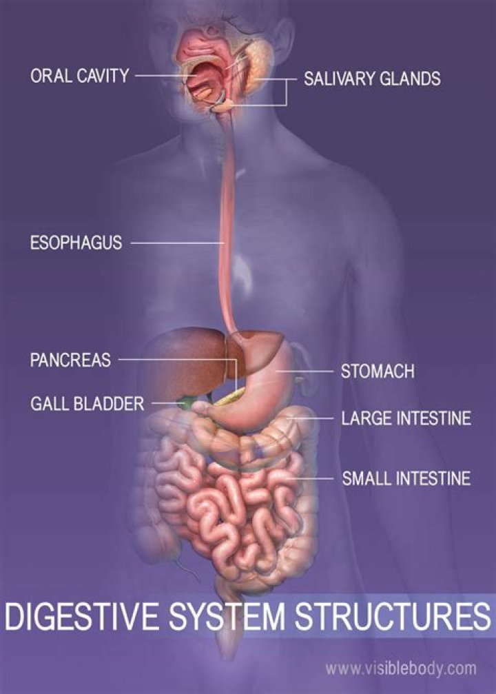 Serves as the body's major digestive organ and is located in all four quadrants of the abdomen. Primarily absorbs water from indigestible food residue and compacts digestive waste. Physical breakdown of foods by teeth and enzymes into smaller particles and mixing food with saliva by the tongue.