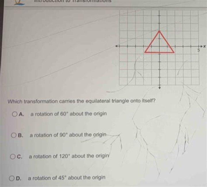 carries the equilateral triangle onto itself. So, these are the correct rotation answer choices: rotation of 120° counterclockwise. rotation of 120° clockwise..