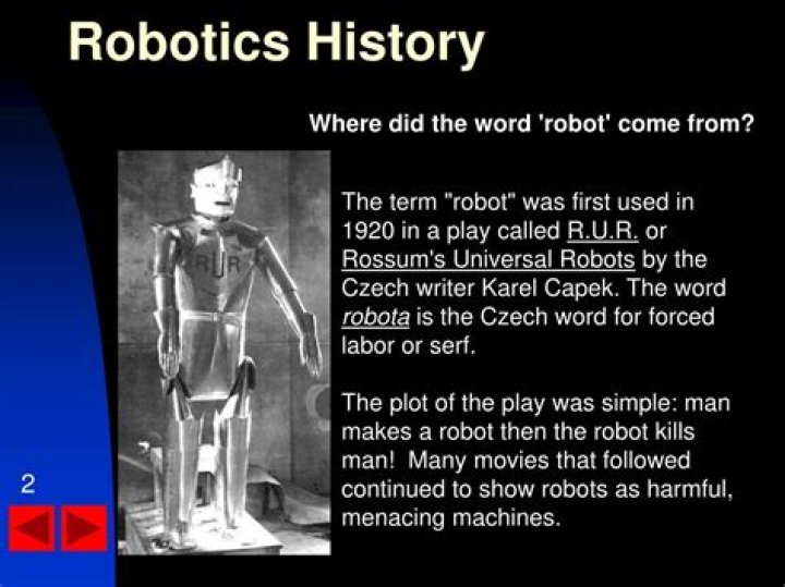The term comes from a Czech word, robota, meaning "forced labor"; the word 'robot' was first used to denote a fictional humanoid in a 1920 play R.U.R. (Rossumovi Univerzální Roboti - Rossum's Universal Robots) by the Czech writer, Karel Čapek but it was Karel's brother Josef Čapek who was the word's true inventor.Can robots harm humans?