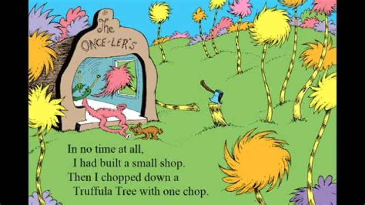 The Once-ler answers that once the world was beautiful, containing a wide variety of happy animals that lived among beautiful "Truffula trees." The Once-ler cut down the trees because they were excellent material to make products he invented called "Thneeds." The "Thneeds" became a huge marketing success, forcing him.