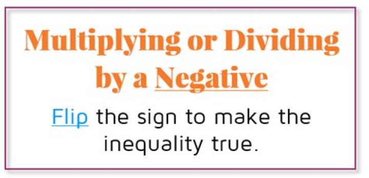 There is one very important exception to the rule that multiplying or dividing an inequality is the same as multiplying or dividing an equation. Whenever you multiply or divide an inequality by a negative number, you must flip the inequality sign.
